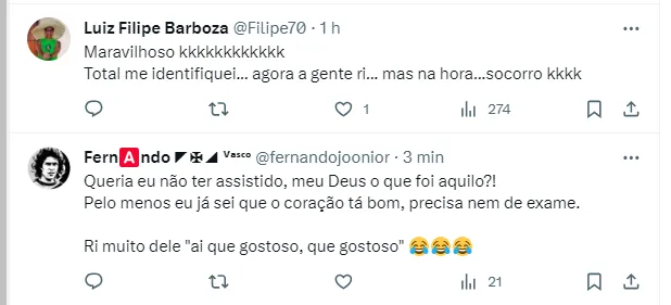 Na hora que ele foi conferir o resultado e pôde descobrir que o rebaixado foi o Santos, o humorista não se conteve e comemorou aliviado. Após isso, o vídeo cortou com ele gritando: “É Vasco, p**”!”.