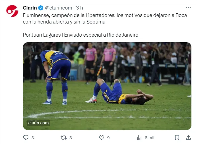 Já o Olé, disse que o Boca deixou de levantar o troféu após grande mobilização de seus torcedores. ”Foi para o Boca. Mais uma vez. A sétima escapou no Rio de Janeiro, onde seu povo montou a maior mobilização da história de um clube em outro país. Isso não será esquecido. Enquanto isso, será um golpe difícil de engolir”, diz trecho do jornal.