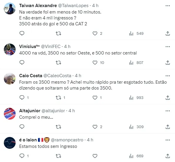 Finalmente, é importante pontuar que cada entrada da categoria 03 custava cerca de R$ 150. E diante da intensa procura que os tricolores demonstraram, o clube nordestino pedirá mais ingressos à Conmebol. E existem ótimas chances de o pedido ser aceito pela entidade, já que tais bilhetes com certeza serão comprados pela fanática torcida do Leão.