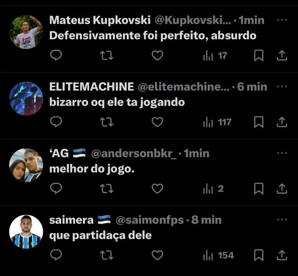 Com as lesões de Reinaldo e Mayk, além da venda de Cuiabano ao Botafogo, Renato preferiu improvisar Fábio na lateral esquerda. Sua atuação foi destacada por alguns torcedores gremistas na rede social X.