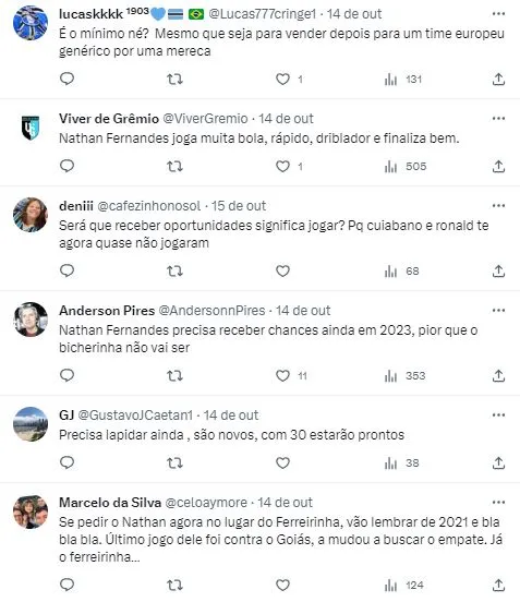 Contudo, está na mão dos 9 jogadores a oportunidade de darem uma guinada em suas carreiras, pois se demonstrarem uma boa performance nos treinos, serão relacionados para os importantes duelos do desfecho do Brasileirão. Alguns dos ‘convocados’, já frequentaram a lista de relacionados de Renato, como são os casos dos atacantes Nathan Fernandes e Freddy, bem como o meio-campista Josué.