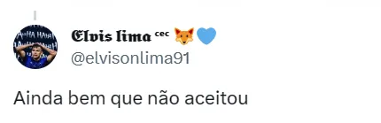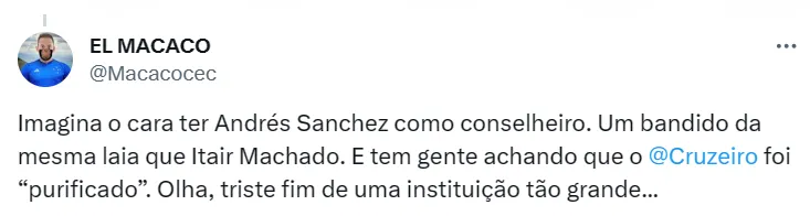 “Era (para ser eu o CEO do Cruzeiro, cargo ocupado por Gabriel Lima). Eu não quis. Eu sou Corinthians. Eu não me vejo trabalhando em outro clube. Um dia, talvez, eu possa ser. Mas hoje eu não me vejo”, disse o ex-presidente do Corinthians em entrevista ao apresentador Benjamin Back.
