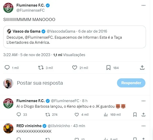 Em postagem, o Vasco zoava o Fluminense sobre o torneio: (SIC) “Desculpe, @FluminenseFC. Esquecemos de informar: Esta é a Taça Libertadores da América”, disse em um tweet o time vascaíno de 2016. Diante disso, de forma irônica, o Fluminense comentou neste sábado: (SIC) “Simmmm mano”, comentou o perfil oficial.