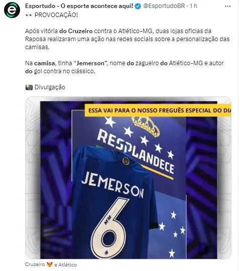 Isso porque o gol que cravou a vitória da Raposa saiu dos pés de Jemerson, zagueiro do Atlético-MG, que marcou contra sua própria equipe. Desta forma, o primeiro Clássico Centenário no recém-inaugurado estádio do rival entrou para história com triunfo do Cruzeiro e ainda levantou a bola para uma zueira que chamou atenção pela alfinetada elaborada e pelo ineditismo da ação. A informação é do portal Globo Esporte.