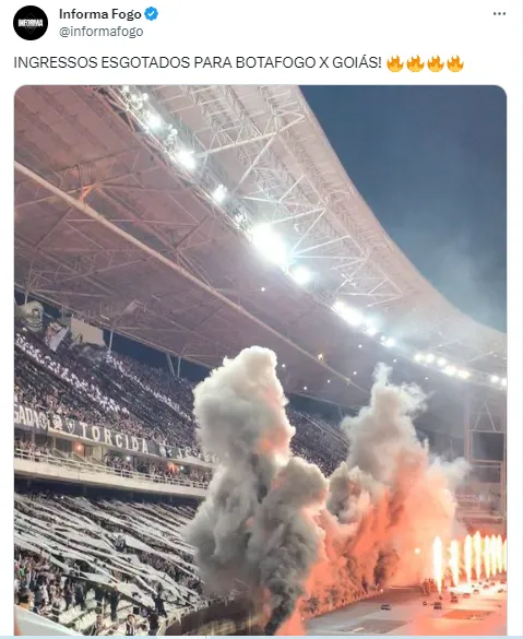 Isso porque, todos os ingressos disponibilizados para a partida contra o Goiás, na segunda-feira, às 20h, estão esgotados. Isso mesmo! TODOS os ingressos disponibilizados para a partida foram esgotados de forma antecipada. Certeza que com esse público, o Fogão dará tudo de si para trazer mais uma vitória e se aproximar do título do Brasileirão.