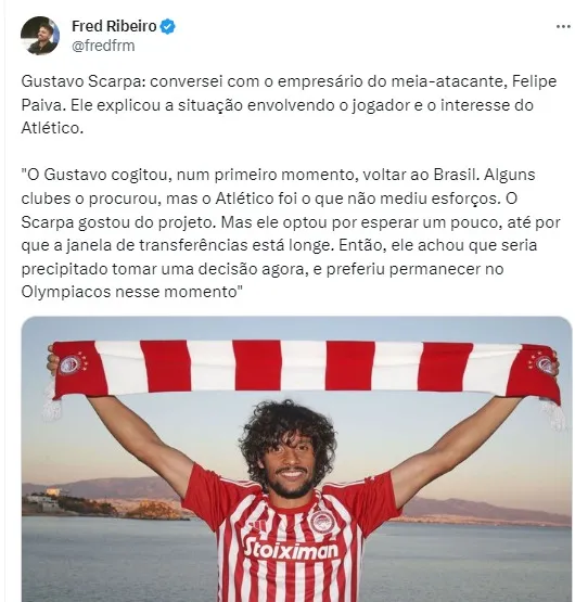 Ele ainda afirmou que o projeto agradou o atleta: “O Scarpa gostou do projeto. Mas ele optou por esperar um pouco, até porque a janela de transferências está longe. Então, ele achou que seria precipitado tomar uma decisão agora, e preferiu permanecer no Olympiacos nesse momento”, disse.