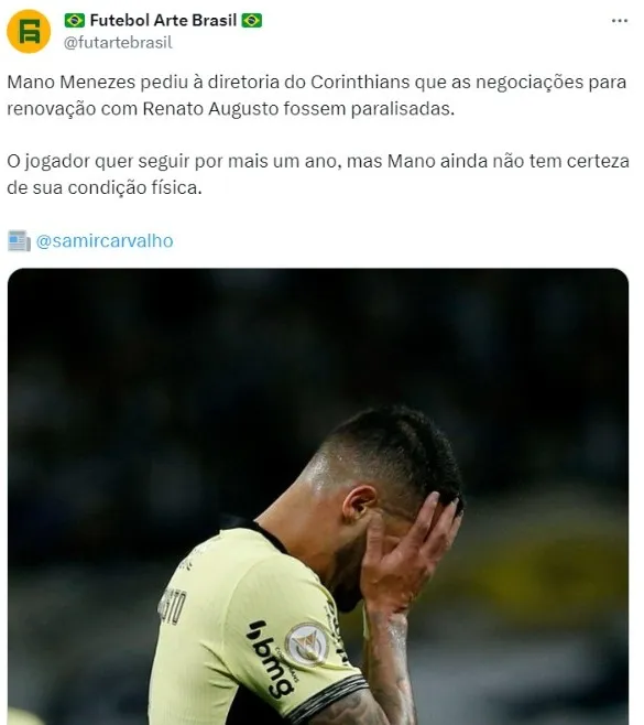 Mano Menezes solicitou à diretoria do Corinthians que não concretizasse a renovação de contrato de Renato Augusto. O treinador não está convencido de que o atleta tem capacidade física para vestir a camisa do time por mais uma temporada.