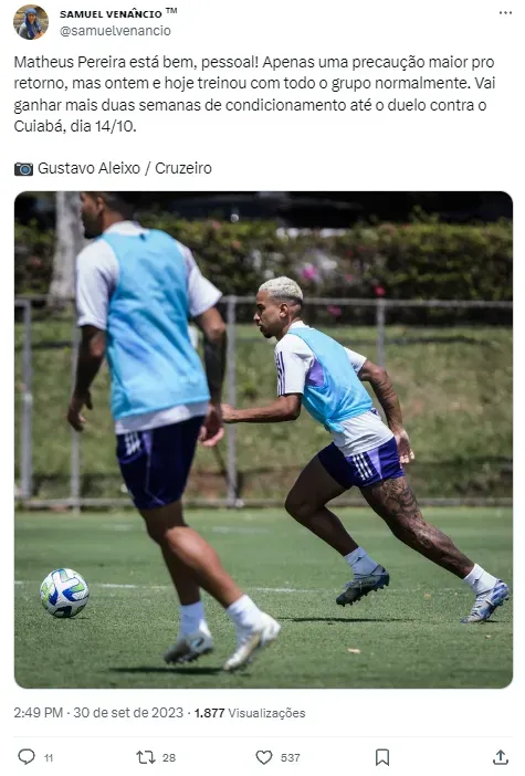 De acordo com o jornalista, o meio-campista está de fato bem, em processo de recuperação de uma lesão ligamentar no joelho. De forma cautelosa, o Cruzeiro preferiu seguir mais duas semanas de condicionamento físico para Matheus Pereira, que deve retornar após dois meses no duelo contra o Cuiabá, no dia 14 de outubro. Em 13º colocado na tabela da Série A, o Cruzeiro busca agora se firmar em uma das vagas continentais para a próxima temporada.