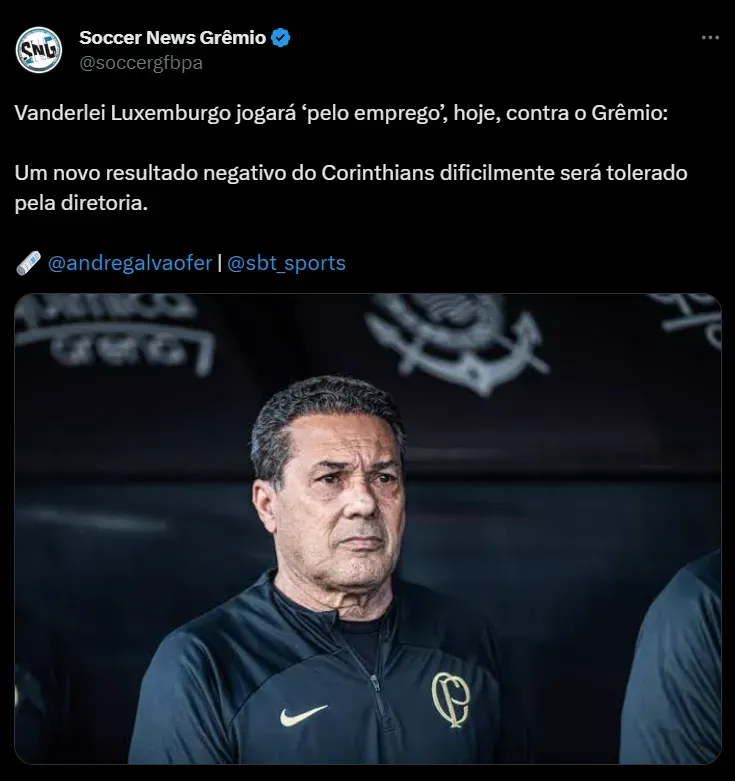 No entanto, outro fator faz o jogo desta segunda-feira (18), ser MUITO importante para o Corinthians. As informações que chegam da imprensa do Centro do país dão conta que Vanderlei Luxemburgo ‘jogará pelo seu emprego’ contra o tricolor gaúcho de Renato Portaluppi. A notícia já chegou na torcida gremista, que está repercutindo como isso vai impactar o jogo e qual será o resultado do duelo.