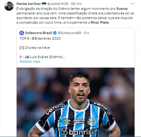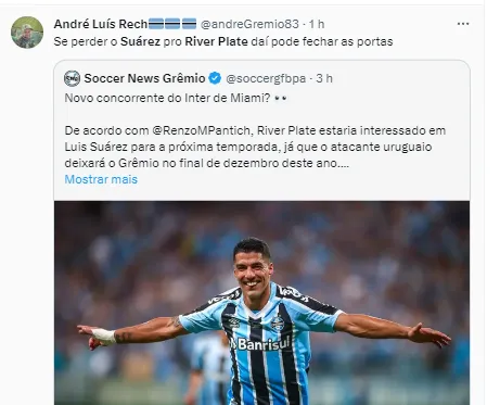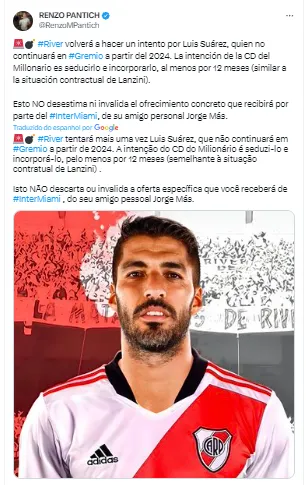 “River Plate tentará mais uma vez Luís Suárez, que não continuará no Grêmio a partir de 2024. A intenção do CD do Milionário é seduzi-lo e incorporá-lo, por pelo menos 12 meses (semelhante à situação contratual de Lanzini). Isto não descarta ou invalida a oferta específica que ele receberá do Inter Miami-EUA, do seu amigo pessoal Jorge Más”, informou o jornalista Renzo Pantich em suas redes sociais.