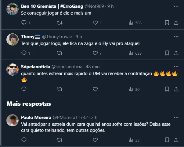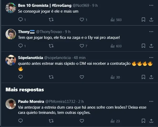 Até por isso, a comissão técnica vem intensificando os treinamentos para tê-lo disponível o quanto antes. Todavia, até pelo histórico recente, a atitude gerou polêmica e causou divisão entre os gremistas.