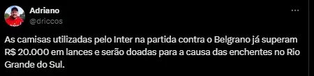 O clube encerrou o leilão on-line das camisetas sujas de barro, que foram usadas por seus jogadores no jogo contra o Belgrano, pela quinta rodada da fase de grupos da Copa Sul-Americana. No total da ação, foram arrecadados cerca de R$ 270 mil.