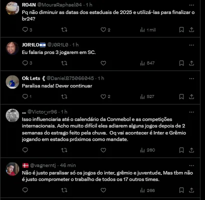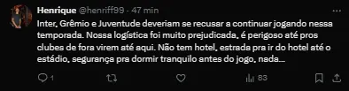 Como já relatado, isso não agrada às equipes do Rio Grande do Sul. Uma vez que em algum momento da temporada, essas partidas precisarão ser realizadas e isso poderá ser um problema.