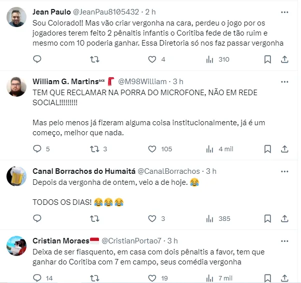 Neste domingo (29), o Internacional entrou em campo no Beira-Rio para enfrentar a equipe do Coritiba, em jogo válido pela 30ª rodada do Campeonato Brasileiro. A derrota por 4 a 3 não caiu bem para os colorados, que reclamaram muito da arbitragem.