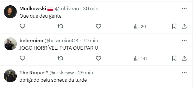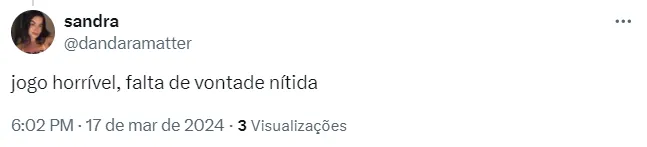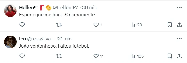 Nas redes sociais a torcida não deixou barato, e reclamou da partida da equipe, com muitos analisando que o jogo foi “horrível”, e destacando a partida como “a pior do ano” do Inter. Confira mais comentários ao fim da matéria.