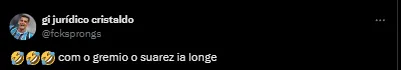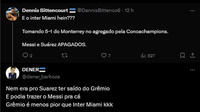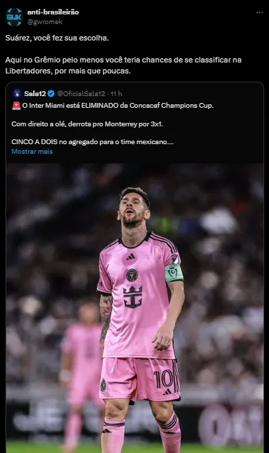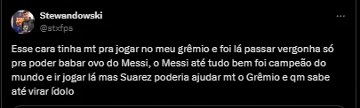 Um outro torcedor reforçou que se ele faz questão de jogar com o camisa 10 argentino é só trazer ele junto para o Rio Grande do Sul. “Nem era para o Suárez ter saído do Grêmio e podia trazer o Messi para cá. O Tricolor é menos pior que Inter Miami”, postou.