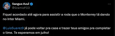 Até um possível pedido de retorno do craque foi pedido nas redes sociais. “Fiquei acordado até agora para assistir a roda que o Monterrey está dando no Inter Miami. Já pode voltar para casa e trazer teus amigos para completar o time. Te esperamos em julho”, afirmou.