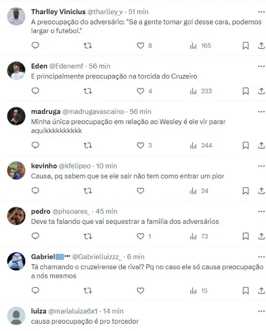 Um dos integrantes da comissão técnica do Cruzeiro, Seabra, destacou que, mesmo com as chances perdidas nos últimos jogos, Wesley causa preocupação nos adversários e é fundamental para a equipe.