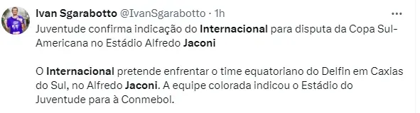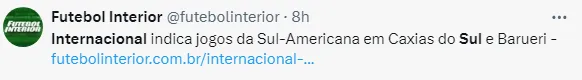 Na noite de segunda-feira (20) o Inter oficializou que vai jogar contra o time argentino na Arena Barueri e contra o time equatoriano no Estádio Alfredo Jaconi. Foi uma novidade, pois o jogo do dia 28 estava previsto no Novelli Júnior, casa do Ituano.