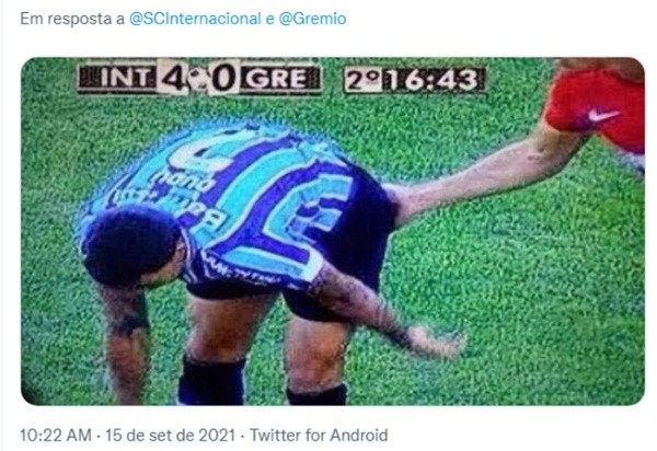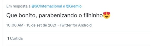 “Parabéns, Grêmio, pelos seus 118 anos“, escreveu o Inter. Os torcedores do time do Beira-Rio, então, aproveitaram a oportunidade para tirar sarro do Tricolor Gaúcho. “Que bonitinho, o pai desejando feliz aniversário para o filho”, brincou uma usuária do Twitter.