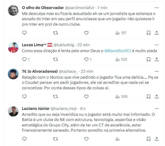 “Algumas pessoas próximas a Jean Lucas garantem que ele não quer ir para o Bahia. Se for para ser comprado pelo City, vá para outro time do grupo. O projeto do #Inter lhe interessa mais. Mas o #Santos precisa da grana para o seu 2024“.
