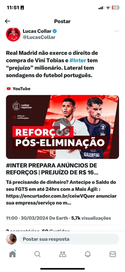 “O Inter tem um direito de 20% do passe, com a opão do Real Madrid de não comprar o lateral, o Colorado ficou sem faturar R$ 16 milhões no total. Alguns Clubes estão sondando a situação de Vinicius Tobias, como o Sporting e o Porto de Portugal”, disse em seu canal do Youtube.