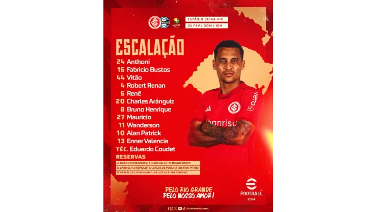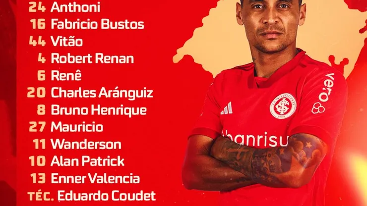 O Colorado vai a campo com o seguinte time: Anthoni, Fabricio Bustos, Vitão, Robert Renan e Renê; Charles Aránguiz, Bruno Henrique, Mauricio e Alan Patrick; Wanderson e Enner Valência