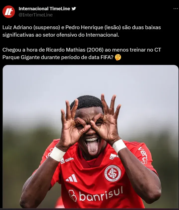 Os comentários nas redes sociais falam de situações como: “Esse joga, tem que dar uma chance pra ele mesmo que seja novo” e “Imagina o que ele pode aprender com o Enner, tem que aproveitar a parada da Data FIFA e levar ele para o profissional. Lembra o Damião”. Nas categorias de base, o centroavante marcou 16 gols em 24 jogos em 2023.