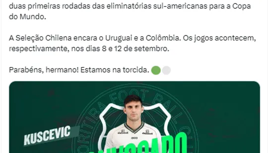 Na madrugada deste sábado (26), a Seleção Chilena divulgou a lista de convocados para as duas primeiras rodadas das eliminatórias e o zagueiro Kuscevic foi chamado pelo técnico Eduardo Berizzo para os duelos contra o Uruguai e a Colômbia. Os jogos acontecem, respectivamente, nos dias 8 e 12 de setembro.