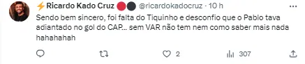 “Eu vi o lance do Tiago Heleno de frente, acabou não tendo VAR por causa da queda de luz. Na minha opinião, o Tiquinho acabou empurrando ele com as duas mãos, na minha visão foi falta. Mas faz parte. Vamos trabalhar para o segundo tempo, quando estiver e estar preparados” , comentou Kaíque na zona mista após a suspensão da partida.