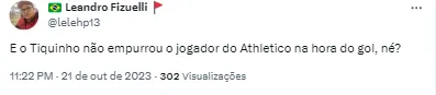 O zagueiro do Furacão, Kaíque Rocha viu falta de Tiquinho Soares no gol do Botafogo. A equipe carioca abriu o placar aos 23 minutos do primeiro tempo com Tiquinho, de cabeça, após cobrança de escanteio. No lance, jogadores do Athletico pediram um empurrão do jogador alvinegro em cima de Thiago Heleno, mas o árbitro não marcou nada e, o VAR não estava funcionando justamente devido às quedas de energia no estádio.