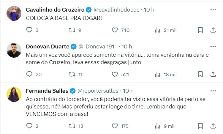 Após o resultado conquistado, Ronaldo extravasou nas redes sociais. Já que a vitória nos últimos minutos foi motivo de alívio para o ex-jogador que comemorou o feito realizado pela equipe. “Foi na raça, no coração! Vamos, Cruzeiro!”, escreveu o mandatário.