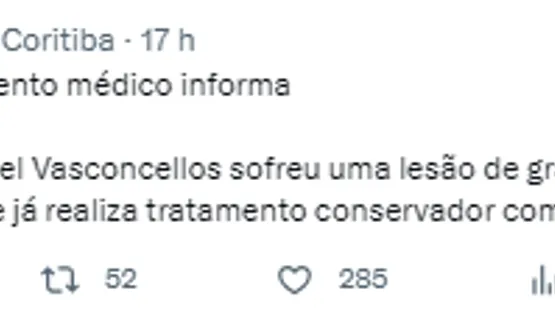 O Coritiba recebeu uma notícia ruim na última terça-feira (29). O goleiro Gabriel Vasconcelos teve uma lesão de grau 2 na panturrilha direita após sair com dores na região após a derrota para o Fortaleza por 3 a 1 no último domingo, pelo Campeonato Brasileiro. O jogador que já realiza tratamento conservador com a fisioterapeuta, desembarcou na última segunda-feira mancando, como informou o Globo Esporte.