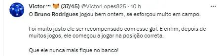 O atacante Bruno Rodrigues voltou a ficar em alta na equipe. O jogador voltou a ser decisivo na vitória em cima da equipe baiana marcando o terceiro gol diante de 36 mil pessoas no Mineirão. Depois de ter amargado no banco de reservas, voltou ser titular e está se aproximando de um momento especial: sua temporada mais artilheira da carreira. Neste ano, ele soma 10 gols e seis assistências em 40 partidas, ficando apenas um de sua melhor.