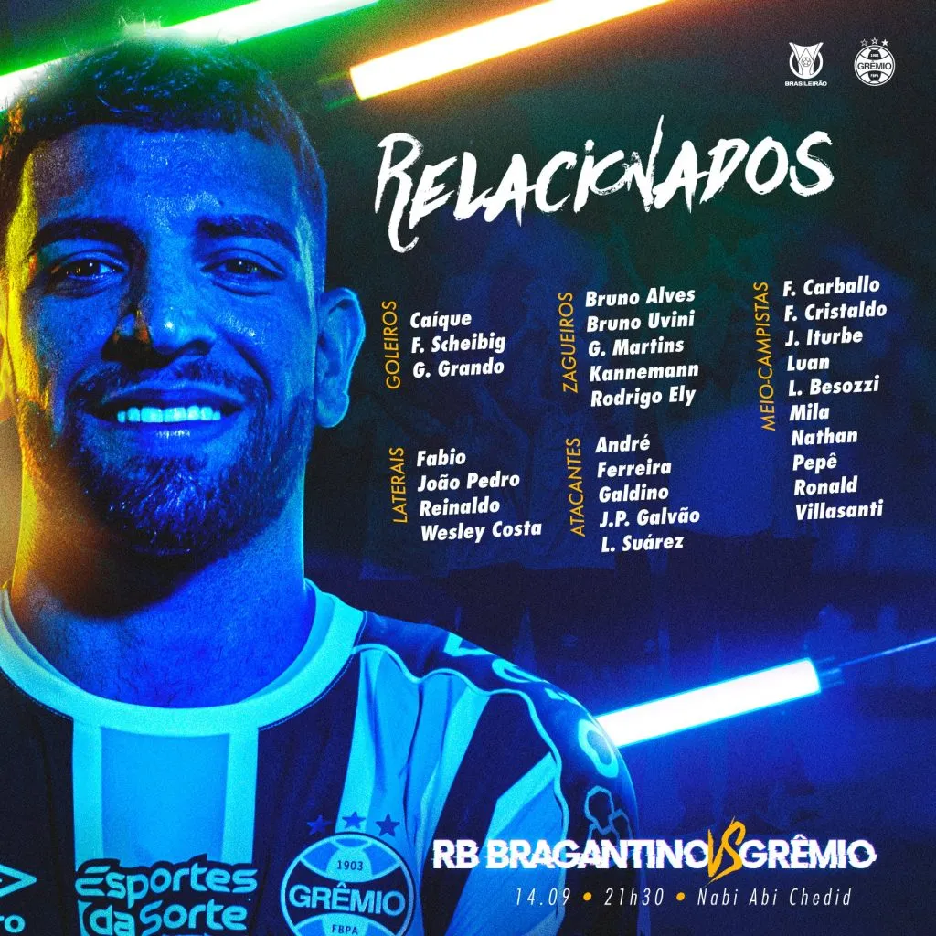 Confira a lista de relacionados do Grêmio: Caíque, Gabriel Grando e Felipe Scheibig (goleiros); Bruno Alves, Bruno Uvini, Gustavo Martins, Kannemann e Rodrigo Ely (zagueiros); Mila, Pepê, Ronald, Villasanti e Carballo (volantes); Fábio, João Pedro, Reinaldo e Wesley Costa (laterais); Cristaldo, Iturbe, Luan, Lucas Besozzi e Nathan (meias); André, Ferreira, João Pedro Galvão, Galdino e Luis Suárez (atacantes).