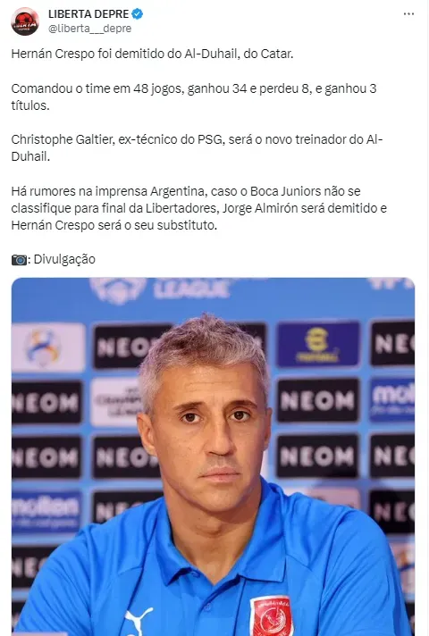“Assim como Luís Castro que veio do Al Duhail, Hernán Crespo o próximo técnico do Botafogo?”, questionou um adepto do Glorioso.