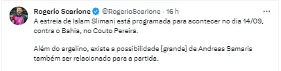 Segundo informações do jornalista Rogerio Scarione, a estreia do reforço argelino Islam Slimani está programada para esta partida, diante da torcida. Compromisso com ares de “decisão”, o técnico pode ter o reforço de peso, que chegou ao Brasil com muita festa dos torcedores no aeroporto. Como o jogo contra o São Paulo, que seria neste domingo (3) foi adiado para o dia 27, fica a expectativa da estreia do jogador em casa.