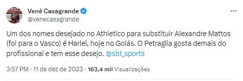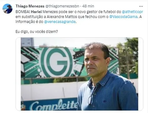 Trata-se de Harlei Menezes, ex-goleiro que recentemente se desligou do Goiás, onde exercia a função de vice-presidente de futebol. Segundo Vêne, Petraglia gosta do trabalho de Harlei e o seu desejo é fechar a contratação.