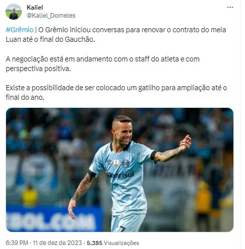 No entanto, as conversas com Luan ganharam informações apuradas pelo jornalista Kaliel Dorneles, setorista do Imortal pela Rádio Bandeirantes. As conversar já iniciaram e a princípio, duas possibilidades estão sendo consideradas.