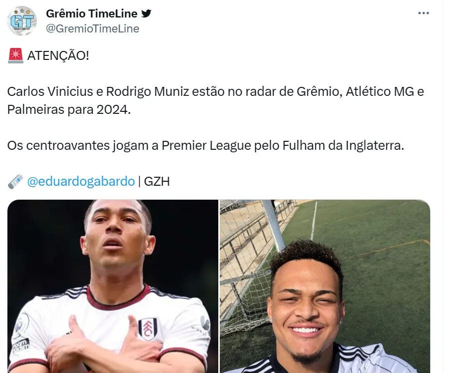 Resta saber se a influência de Renato Portaluppi e o projeto no Grêmio – que deve também estar na Libertadores de 2024 – vai seduzir o atacante. Carlos Vinícius chegou ao Fulham em setembro de 2022 em uma negociação na casa dos R$ 25 milhões.