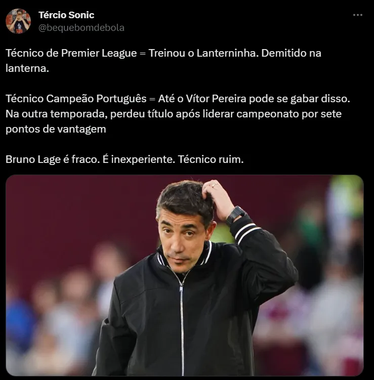 Porém, a torcida colocou o resultado na conta do comandante português. “Bruno Lage é mais hater do Botafogo que a torcida rival”, “Bruno lage já pode ir embora” e “Desculpa, mas é inegável que o time caiu MUITO de produção na mão do Bruno Lage, principalmente fora de casa.”