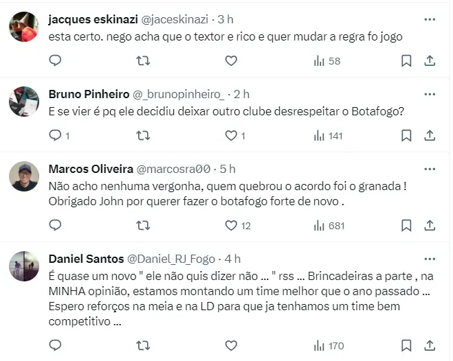 Neste sábado (20), a história ganhou novos capítulos que pode deixar o torcedor botafoguense receoso. O mandatário da SAF do Fogão, John Textor, respondeu um torcedor nas redes sociais sobre o status da negociação de Manafá.