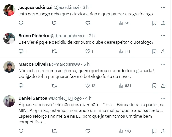 “Só o tempo dirá se são honrosos. Você saberá assim que eu souber. Você também deve saber que nosso departamento de futebol agiu perfeitamente”, escreveu Textor, respondendo sobre um questionamento sobre o porquê o jogador havia sido anunciado.