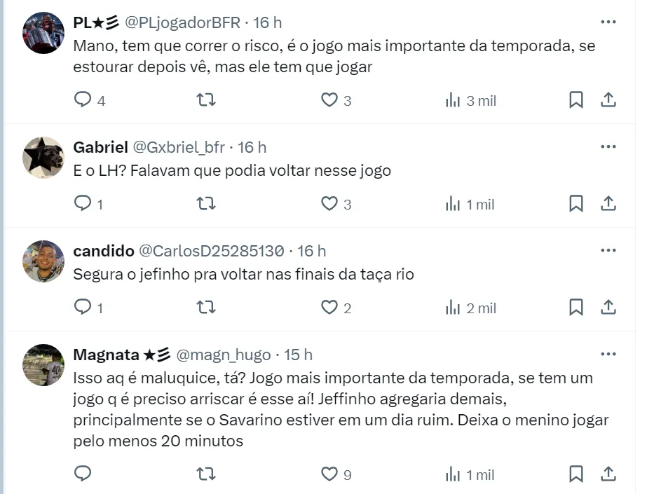 O portal citado acima também explicou que, como Jeffinho tem um biotipo mais magro, “há um temor por um desequilíbrio muscular nos primeiros dias do retorno”. Dessa forma, o Clube Carioca vai projetar o retorno do atacante com calma.