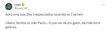“Acho uma boa. Dos 3 especulados na janela os 3 servem Cássio, Santos ou João Paulo… O que vier da pro gasto, são três bons goleiros”. “Hoje em dia, joga mais que o Cássio”, pontuaram tricolores, opinando sobre o goleiro do Santos.