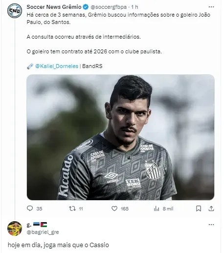 “O departamento de futebol do Grêmio buscou informações a respeito do goleiro João Paulo, do Santos. A consulta ocorreu há cerca de 3 semanas e foi através de intermediários. O contrato do goleiro com o Santos é válido até o final de 2026”, informou o setorista.