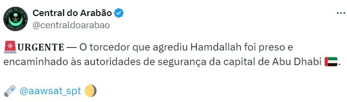 Visivelmente irritado, Hamdallah falou algumas palavras e logo depois jogou água no homem. O torcedor, que foi identificado como da torcida do Al-Hilal, agrediu o jogador com uma espécie de chicote.