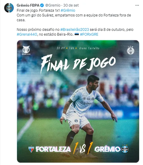 O Grêmio empatou o jogo por 1 a 1 com o Fortaleza na Arena Castelão, e se manteve na segunda colocação do Campeonato Brasileiro, com 7 pontos de diferença para o líder Botafogo. O jogo que tinha tudo para acabar nos conformes, agora preocupa o técnico Renato Gaúcho para a sequência, visto que um de seus principais jogadores da temporada sentiu um desconforto muscular.