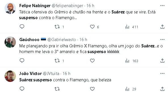 Luis Suárez se junta à crescente lista de desfalques do Grêmio para a próxima rodada do Brasileirão. O atacante uruguaio estava pendurado e recebeu o terceiro cartão amarelo no final da partida, quando o Grêmio foi derrotado por 3 a 0 pelo São Paulo.