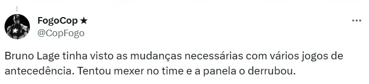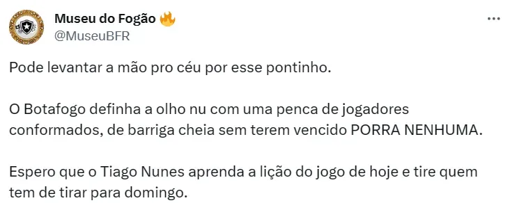 Após a partida, o estreante Tiago Nunes falou com a imprensa e seu discurso não passou muita confiança nem mesmo para o botafoguense mais otimista. O técnico afirmou que o “Botafogo já deu certo”.